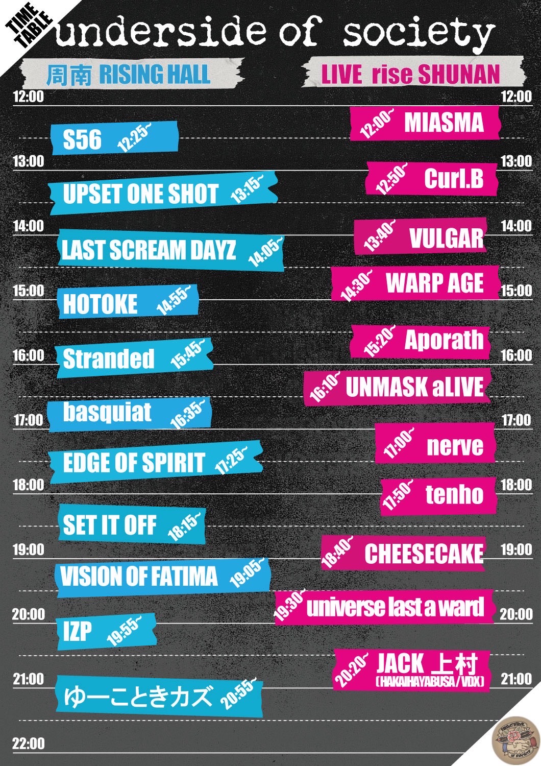 <Acts> basquiat / IZP / EDGE OF SPIRIT / nerve / VISION OF FATIMA / UPSET ONE SHOT / S56 / SET IT OFF / cheese cake / tenho / LAST SCREAM DAYZ / MIASMA / WAPE AGE / Aporath / VULGAR / UNMASK aLIVE / ゆーこときカズ / universe last a ward / JACK上村 ( HAKAIHAYABUSA / VDX ) / Stranded / food: SATO FOODCORE / DJ: FUJIMOTO(SFW!)